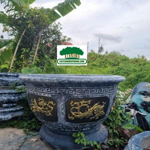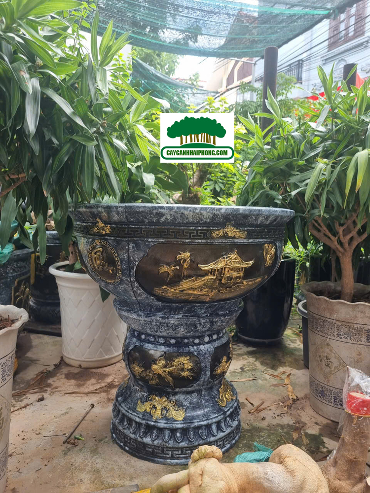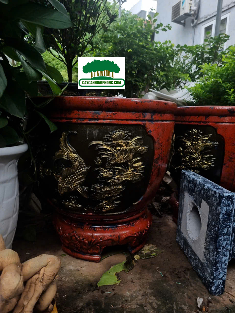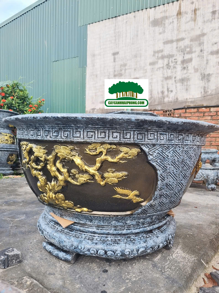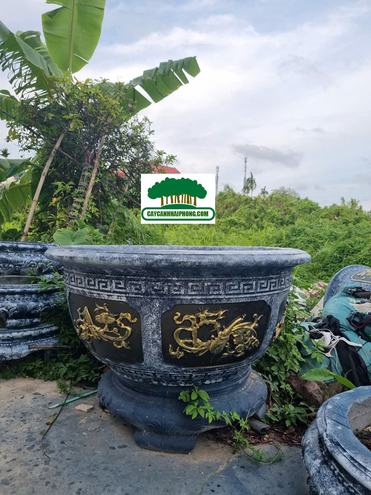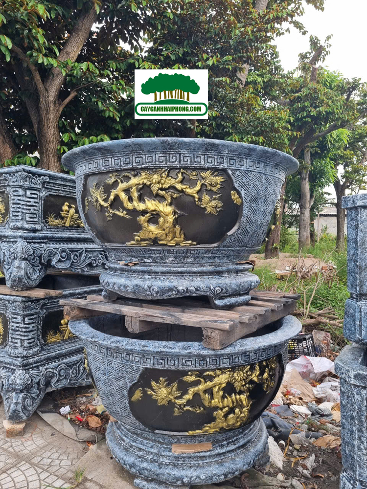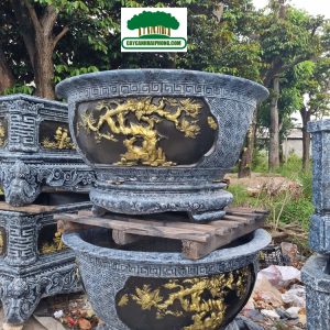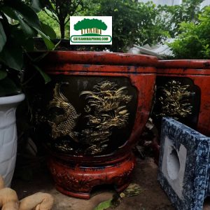 – Chậu xi măng tròn được sơn giả đá bên ngoài, 2 bên là 2 mặt tranh to, sơn phủ đỏ, đen, các nét vẽ tô vàng đẹp, rất sang.