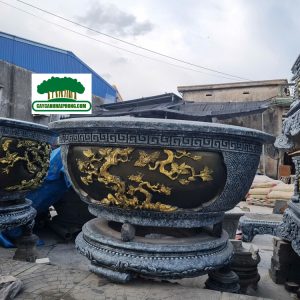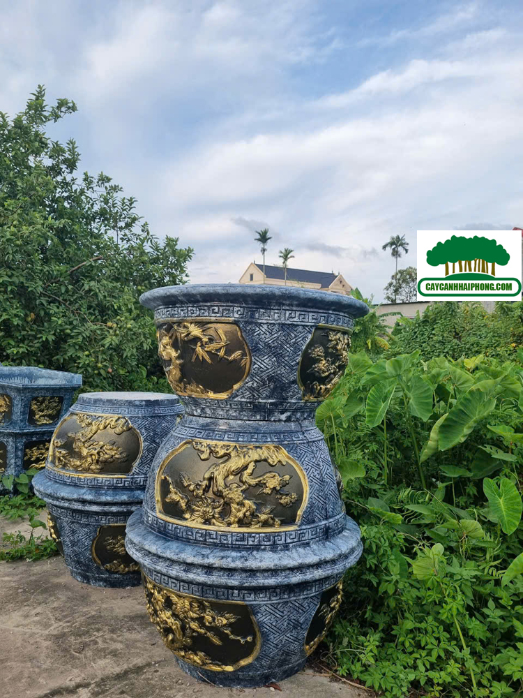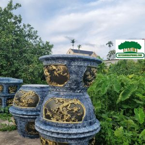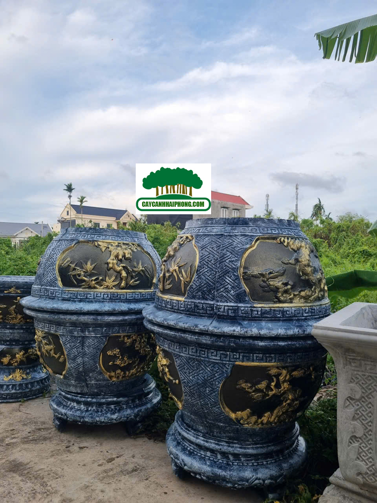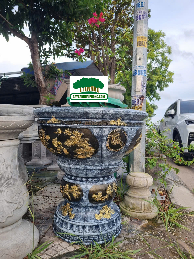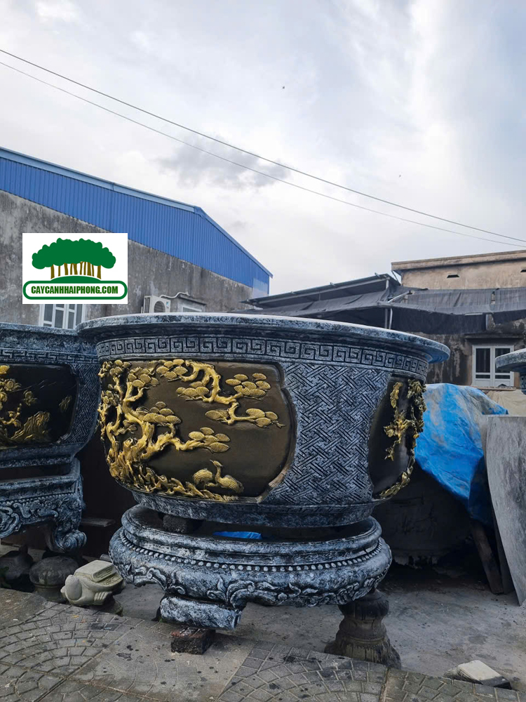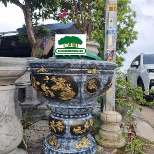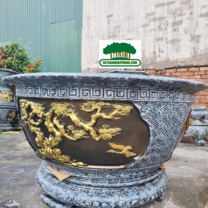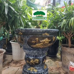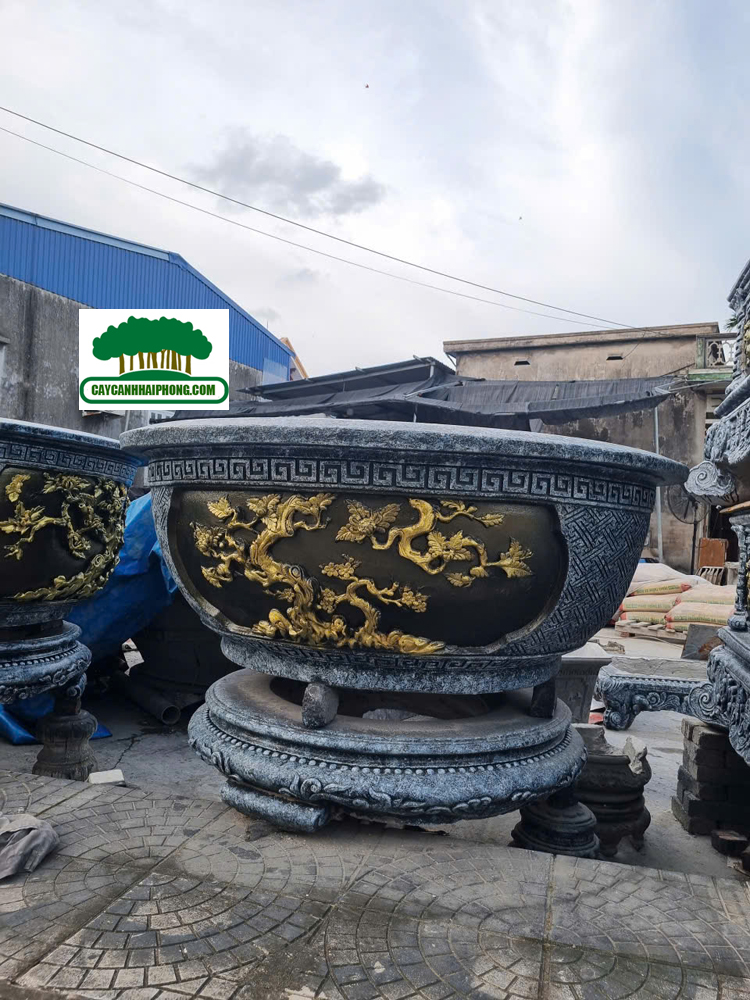 – Chậu xi măng tròn được sơn giả đá bên ngoài, 2 bên là 2 mặt tranh to, sơn phủ đỏ, đen, các nét vẽ tô vàng đẹp, rất sang.