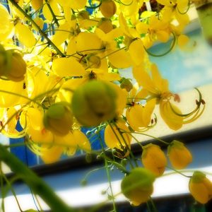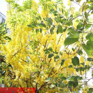 Hoa của cây coa màu vàng rực rỡ, mọc thành từng cụm nhỏ, kết lại thành chùm lớn và rủ xuống. tuy hoa đẹp nhưng hạt của cây lại có độc.